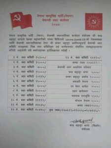 नेपाल कम्युनिस्ट पार्टी मेलम्ची नगर कार्यदलका संयोजक चन्द्रबहादुर थापा र अनेरास्ववियुका सहसंयोजक एवम् नेपाल कम्युनिस्ट पार्टी मेलम्ची नगर कार्यलय कमिटी सदस्य हिरा चौलागाईंको संयुक्त उपस्थितिमा उक्त रकम मेलम्ची नगरपालिका प्रमुख डम्बरबहादुर अर्याललाई हस्तान्तरण गरिएको हो । नेकपा मेलम्चीका कार्यदल संयोजक चन्द्रबहादुर थापाले रकम हस्तान्तरण गर्दै सम्पूर्ण सहयोगी वडा कमिटी कार्यदललाई धन्यवाद दिए ।